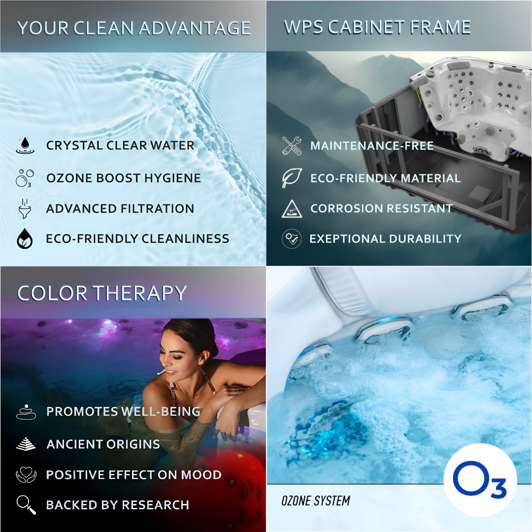 When designing our Atlanta outdoor hot tub, we consciously focused on the physical and mental characteristics of the users. The individually adjustable neck massage jets help in relaxing not only the shoulders and the nape of the neck but the sternomastoid and trapezius muscles as well. Thus, all You have to do after a demanding, stressful day is relax in your personal spa and let the special jets refresh your body. Among the 37 jets are several leg massagers and numerous jets ensuring whole-body relaxation.