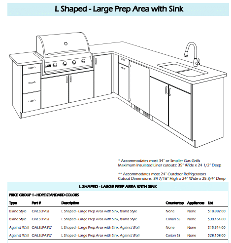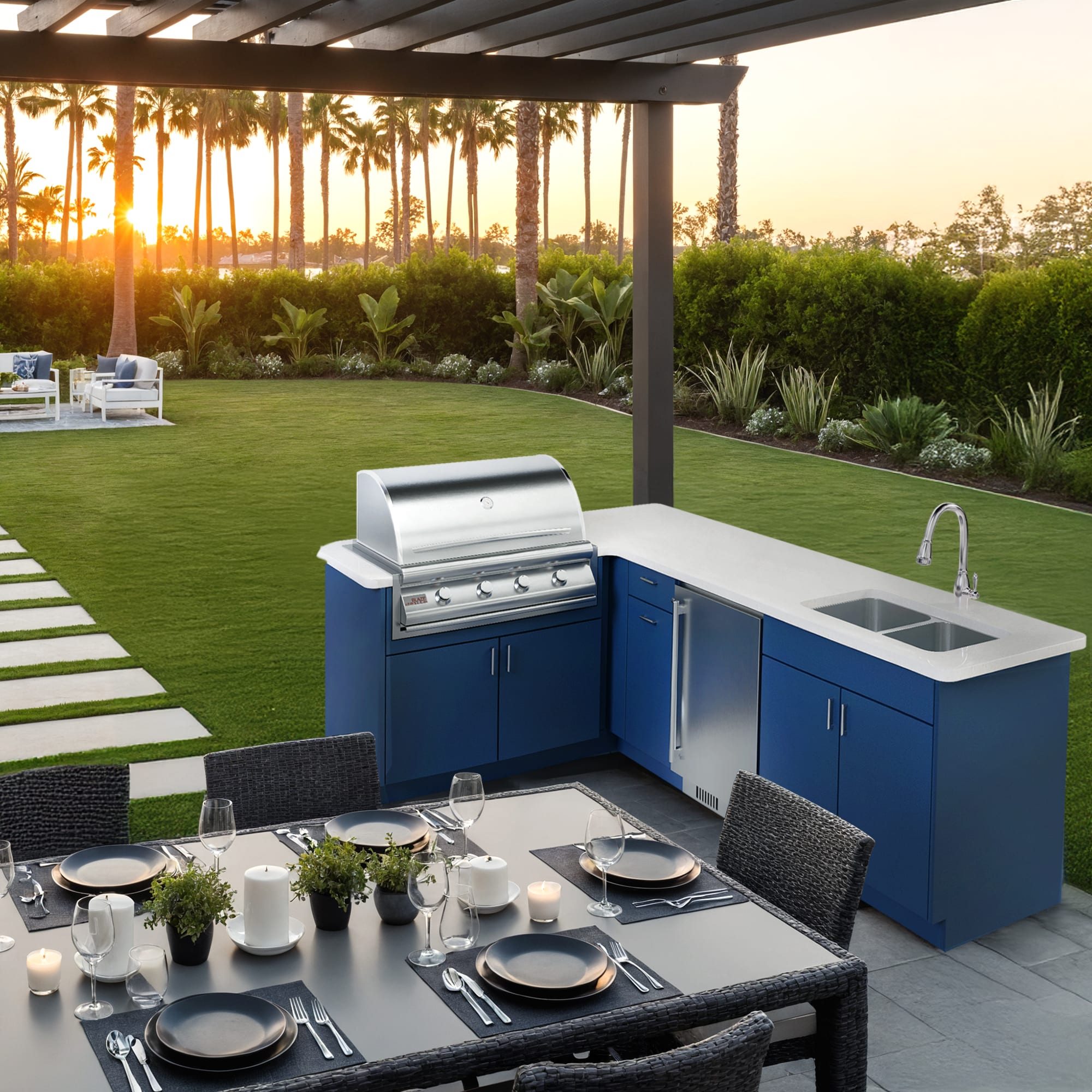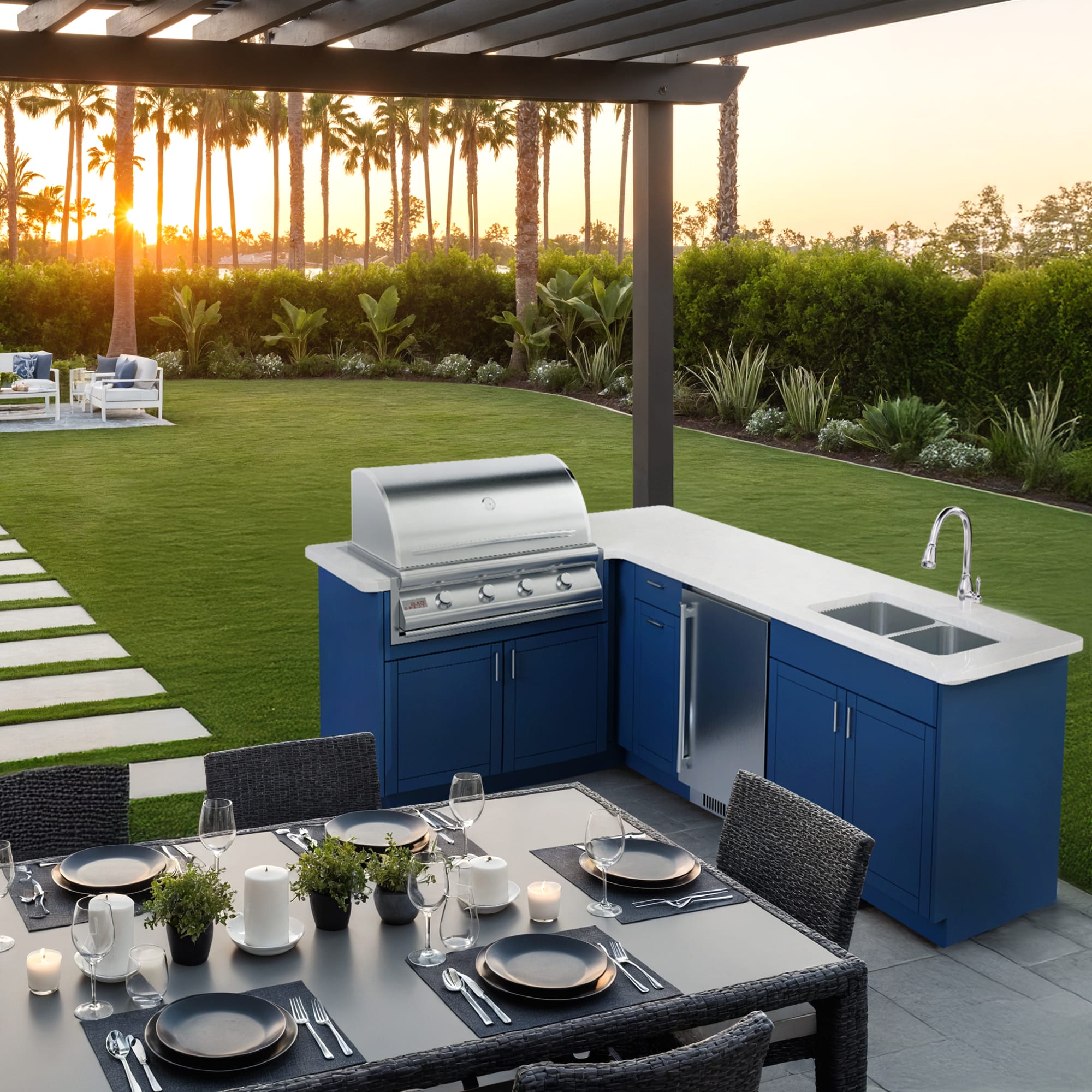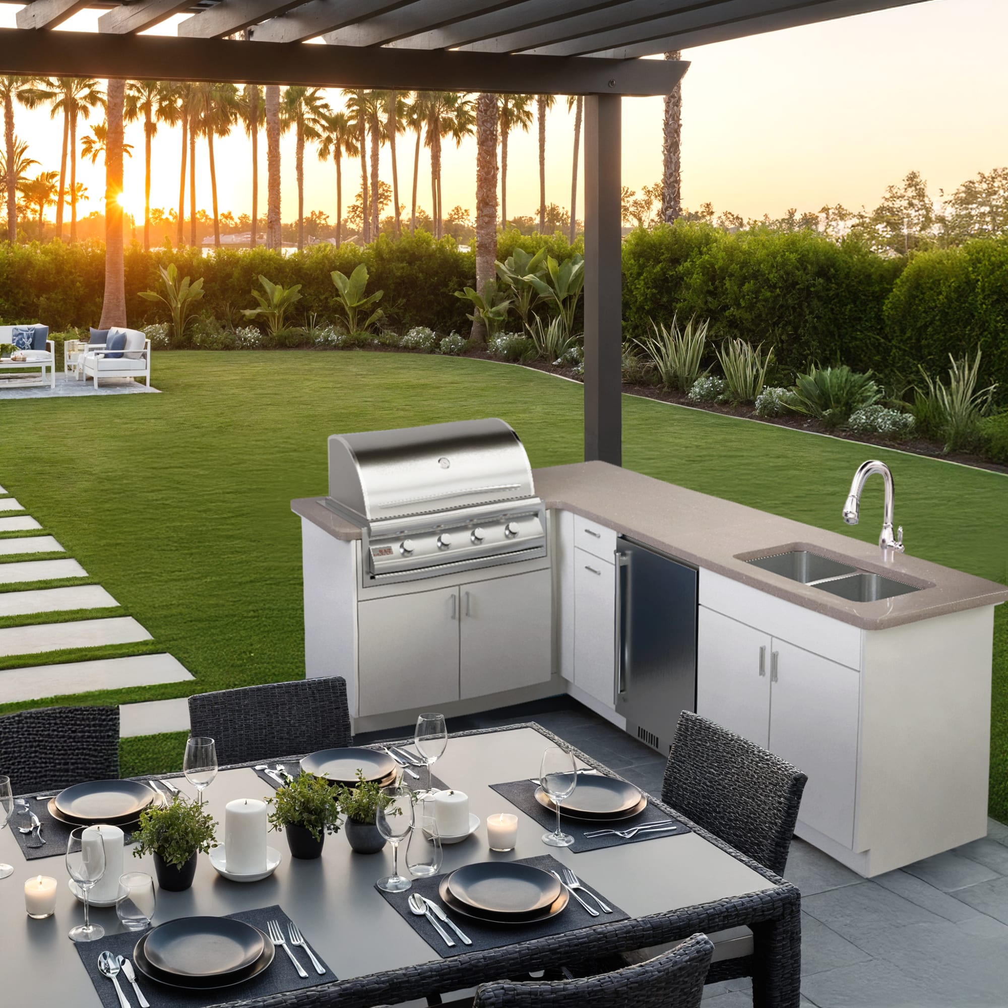 - Includes: High Performance Gas Grill, 24″ Refrigerator, Double Sink with Faucet