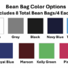 | Bean Bag Color 1 | White, Grey, Black, Navy Blue, Turquoise, Baby Blue, Royal Blue, Maroon, Kelly Green, Pink, Red |