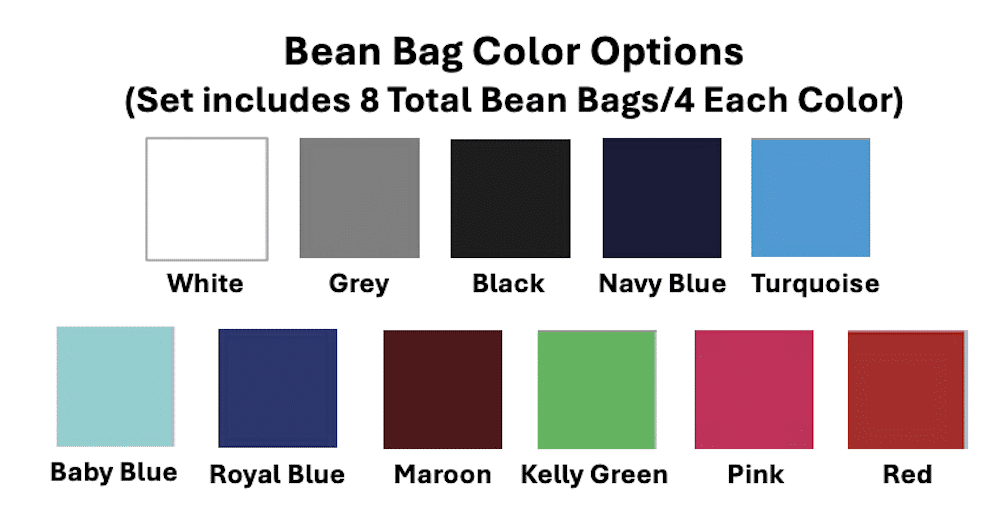 | Bean Bag Color 2 | White, Grey, Black, Navy Blue, Turquoise, Baby Blue, Royal Blue, Maroon, Kelly Green, Pink, Red |