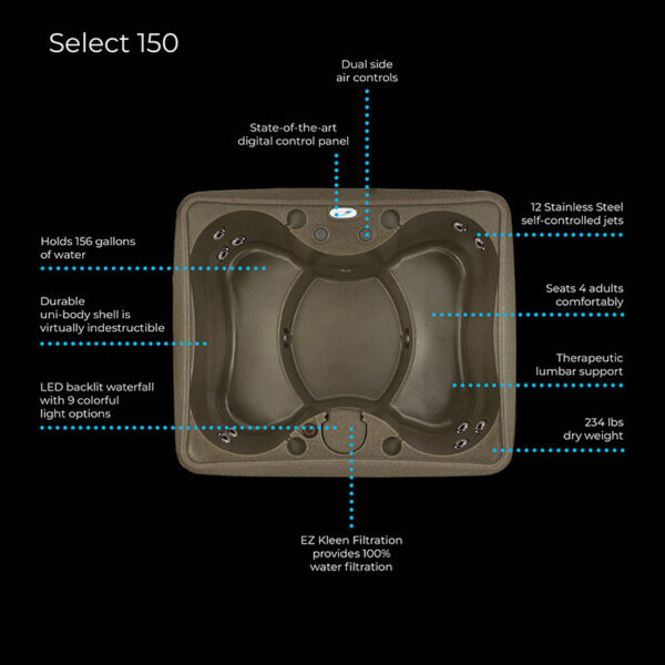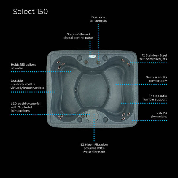 The Select 150 Spa, with 12 Stainless Steel hydrotherapy jets, is unmatched in performance and value. Finally, a real spa, with real therapeutic benefits at a price that is equally relaxing. You can relax knowing your spa is using less energy with full foam insulation and ASTM certified locking safety cover to deliver optimum efficiency. Proudly made in the USA! Built to last and engineered with tough, impact-resistant polyethylene. This outstanding value, comfort and quality are comparable to other spas but at a fraction of the cost. The warm, relaxing hydrotherapy and outstanding performance is delivered through 12 Stainless Steel hydrotherapy jets, with dual side air controls, giving you full control. Your Massage, Your Way! The therapeutic lumbar arch support alleviates achy backs and the multi-level jet placement delivers soothing water pressure that massages every muscle into relaxation. Take relaxation to a whole new level with patented multi-color LED back lit cascading waterfall with 9 colorful light settings to help create just the right ambiance. The EZ Kleen Filtration System, providing 100% water filtration, keeps the water crisp and clean. At 234 lbs., it is easily portable too. Set it up, fill it up, plug it in and enjoy! Time to relax and enjoy this affordable, comfortable spa without breaking the budget. Our quick ship guarantee gets you enjoying your spa life sooner.
